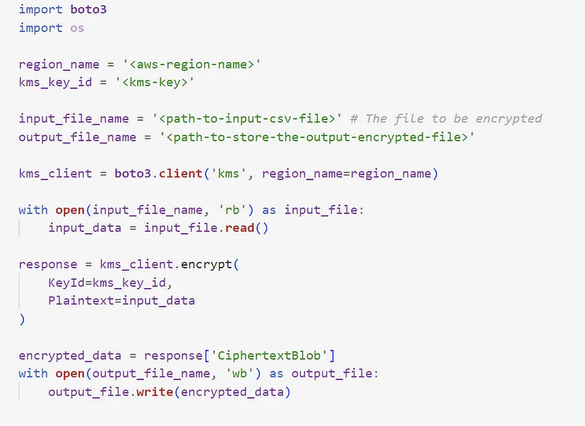 input_file_name = <path-to-input-csv-file>和output_file_name = <path-to-store-the-output-encrypted-file>:指定要加密的输入文件的路径和存储加密输出的路径。