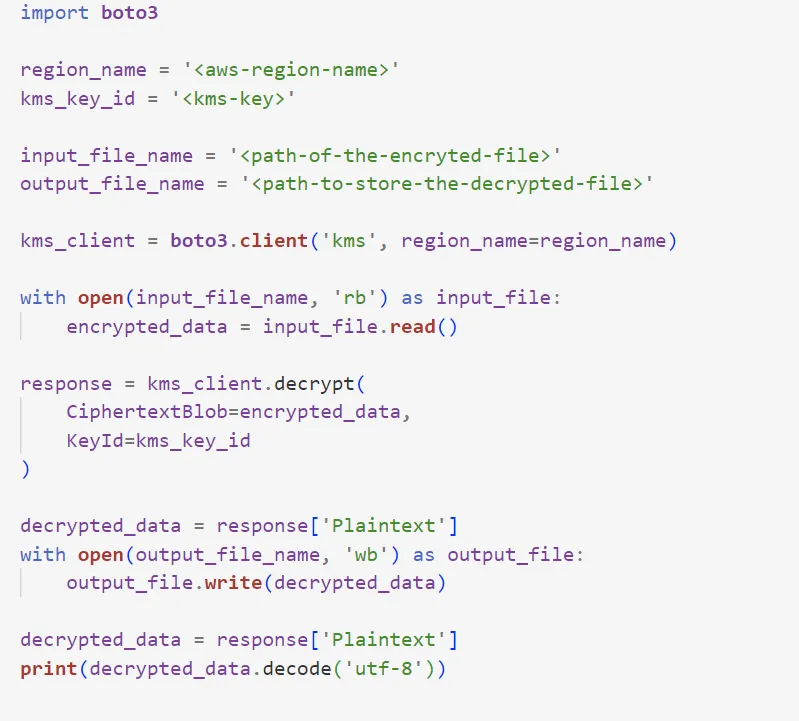response = kms_client.decrypt(...):使用指定的KMS密钥(kms_key_id)解密encrypted_data。从响应中获取解密数据。