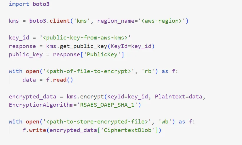 kms = boto3.client(kms, region_name=<aws-region>):为指定的AWS区域设置一个KMS客户端对象。将<aws-region>替换为所需的AWS区域。