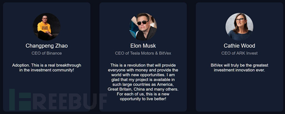 相比之下,这个BitVex加密货币交易平台的官网反而显得更假,在官网介绍中,该平台声称埃隆·马斯克是其首席执行官,并有方舟投资(Ark Invest) CEO凯西•伍德和币安网(Binance) CEO赵长鹏的背书。