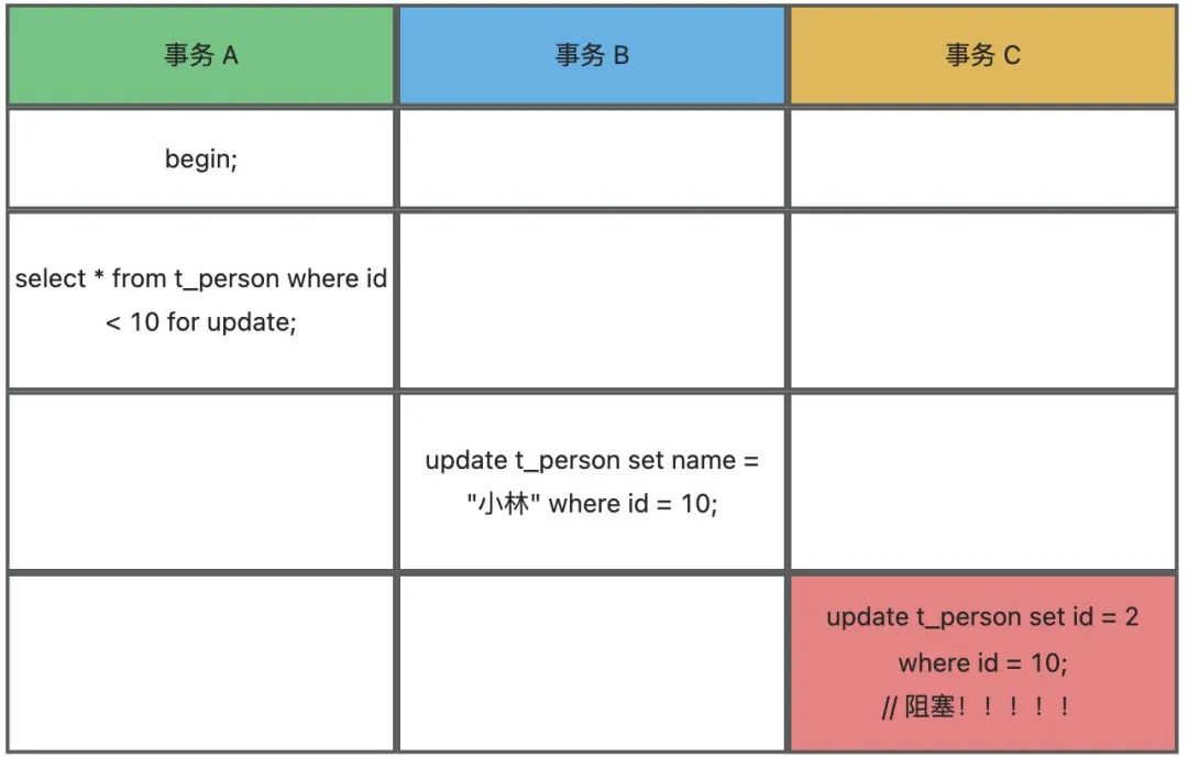 事务 C 的 update 语句为什么会阻塞?