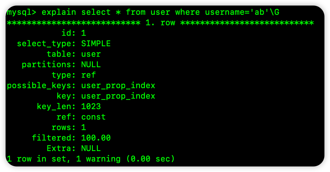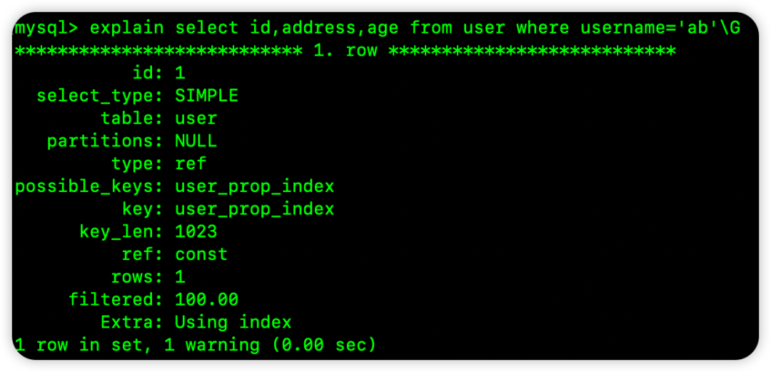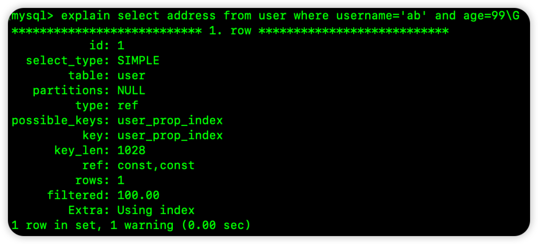 复制CREATE TABLE `user` ( `id` int unsigned NOT NULL AUTO_INCREMENT, `username` varchar(255) COLLATE utf8mb4_unicode_ci DEFAULT NULL, `age` int DEFAULT NULL, `address` varchar(255) CHARACTER SET utf8mb4 COLLATE utf8mb4_unicode_ci DEFAULT NULL, `gender` varchar(2) COLLATE utf8mb4_unicode_ci DEFAULT NULL, PRIMARY KEY (`id`), KEY `user_prop_index` (`username`,`age`,`address`) ) ENGINE=InnoDB AUTO_INCREMENT=11 DEFAULT CHARSET=utf8mb4 COLLATE=utf8mb4_unicode_ci;1.2.3.4.5.6.7.8.9.可以看到,这张表中有一个名为 user_prop_index 的索引,这个索引中一共存在三个字段,分别是 username、age 以及 address,现在我们来看如下 SQL 的执行计划: