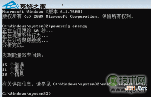 开始→所有程序→附件→命令提示符(右键选择以管理员身份运行)→powercfg energy→回车,系小功 如图:
