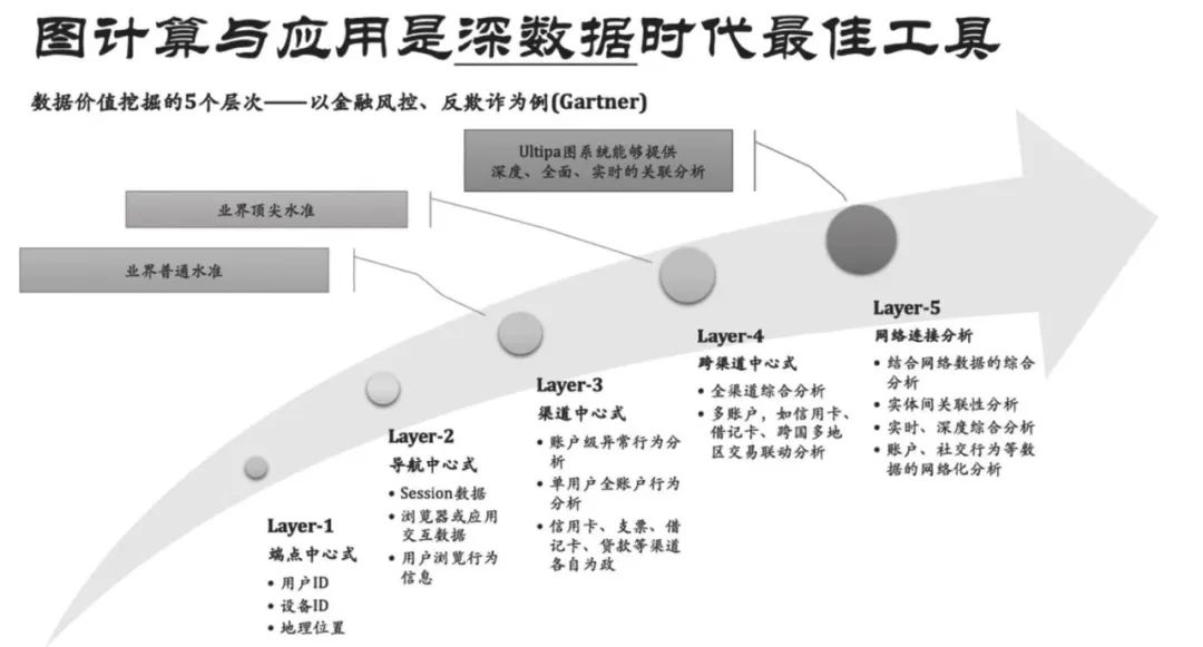 数据分析(技术)的发展是商业发展的必然结果,它提高了数据处理的科技水平。在图6中,从第1层到第2层可以视为数据分析领域内从单机应用到互联应用的提升;第3层是渠道中心化数据分析,它经常发生在一个公司的渠道或部门的内部;第4层的特点是跨渠道,它要求大型公司内的不同渠道进行数据分享,从而最大程度挖掘数据的价值,你必须合并各个渠道搜集到的不同类数据,并把它们视为一个整体,由此来进行网络化分析(例如社交网络分析)。这种通用的、跨部门、跨数据集的多维数据间关联分析需求的挑战,只有图数据库才能完美实现。