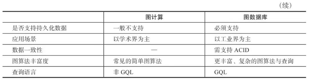 2)图计算框架的运行接口通常是API调用,而图数据库则需要提供更丰富的编程接口,例如API、各种语言的SDK,可视化的图数据库管理及操作界面,以及最重要的图查询语言。熟悉关系型数据库的读者一定不会对SQL陌生,而图数据库对应的查询语言是GQL,通过GQL可以实现复杂的查询、计算、算法调用和业务逻辑。