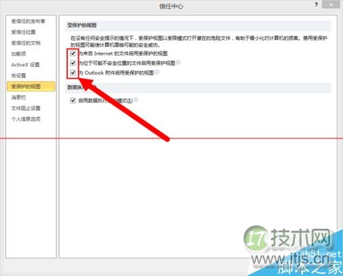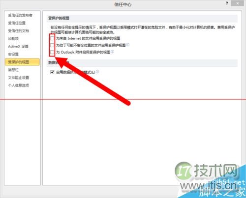 5、点击[受保护的视图],把那里的为***启用受保护的视图三项都去掉,确定。