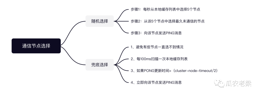 每秒从本地实例列表选择5个节点,在这5个节点中选择最久没有通信的实例,向该实例发送PING消息。
