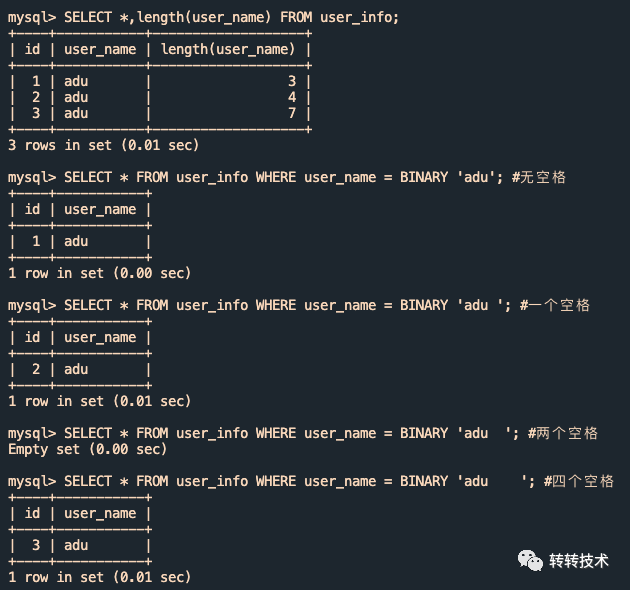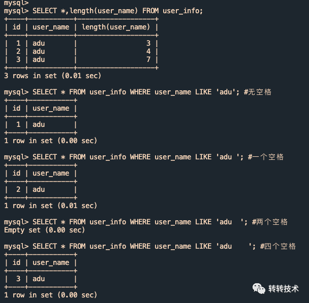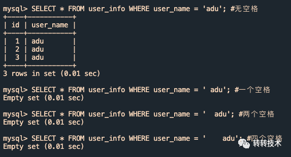 复制SELECT * FROM user_info WHERE user_name = adu; #无空格SELECT * FROM user_info WHERE user_name = adu ; #一个空格SELECT * FROM user_info WHERE user_name = adu ; #两个空格SELECT * FROM user_info WHERE user_name = adu ; #四个空格1.2.3.4.我们使用如上条件去查,还真复现了!无论查询中尾部带有几个空格,结果是一样的,都会命中adu、adu 、adu 三个用户,结果如下图所示(红框圈起来的表示我们认为不应该出现的异常结果):