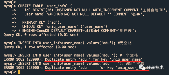 INSERT INTO user_info(user_name) values(adu); #无空格INSERT INTO user_info(user_name) values(adu ); #一个空格INSERT INTO user_info(user_name) values(adu ); #四个空格1.2.3.4.5.6.7.8.9.10.11. 2.2 问题验证2.2.1 尾部空格验证