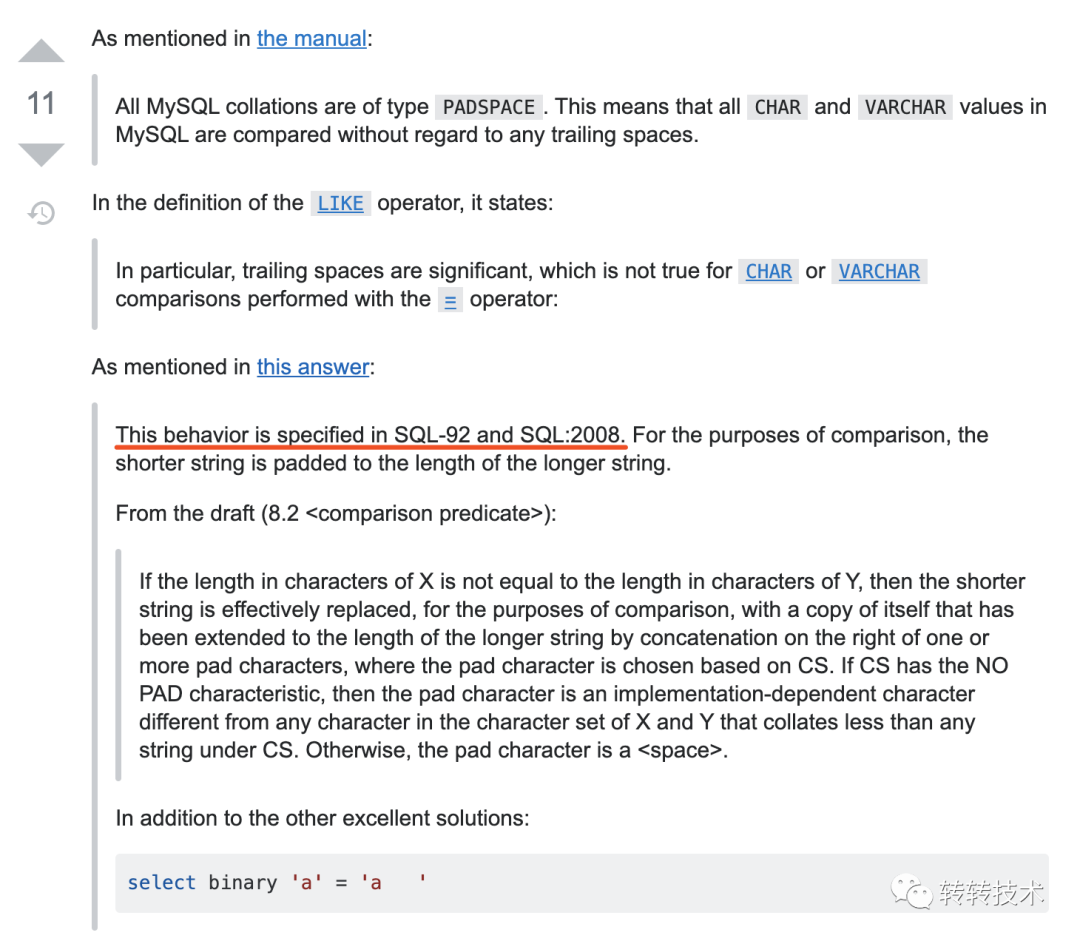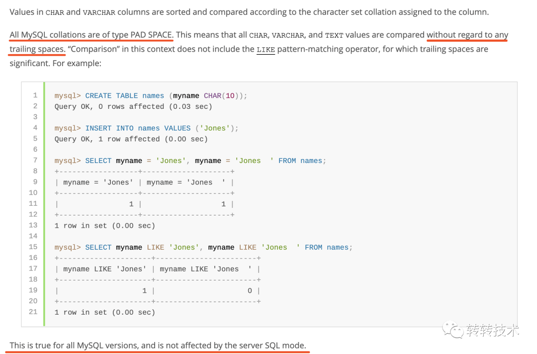 原来MySQL的校对规则基于PAD SPACE,这就意味着CHAR、VARCHAR、TEXT等字符串的等值比较(“=”)会忽略掉尾部的空格,而且官网也说了,适用于所有MySQL版本,并且不会改变。这。。。