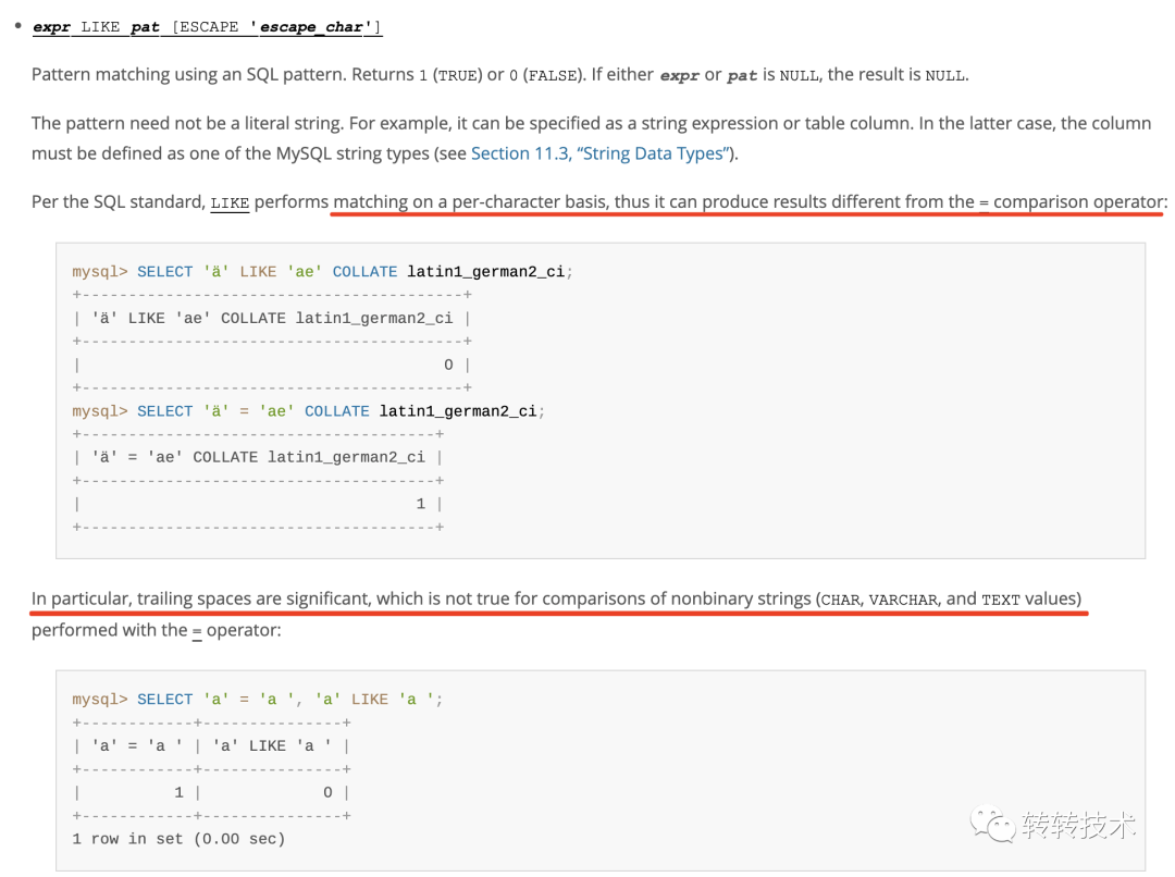 4.1 LIKELIKE是基于逐个字符进行比较的,这样就不会忽略尾部的空格,官网对这块也有特别的说明。