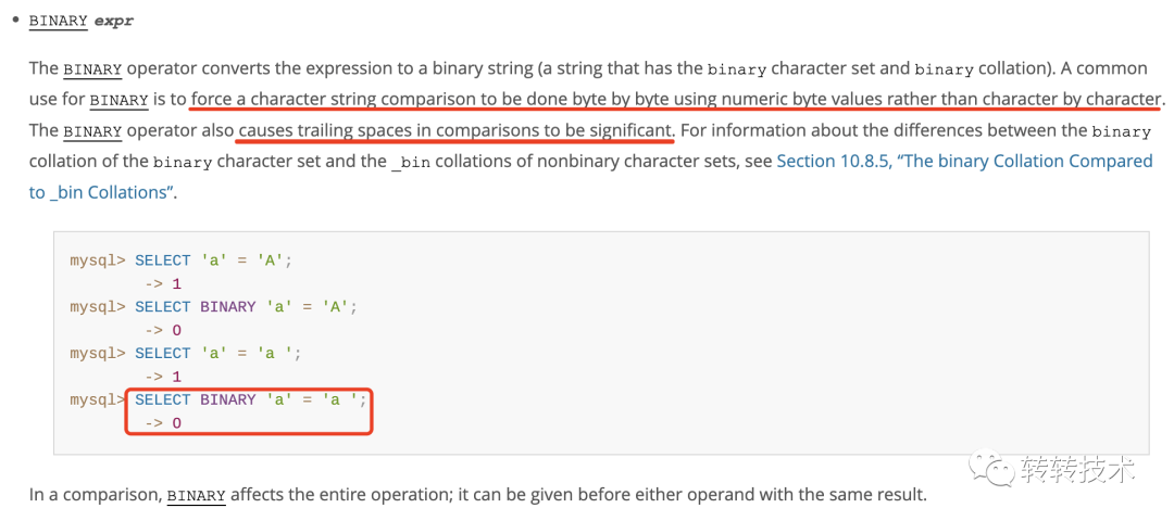BINARY不是函数,是类型转换运算符,它用来强制它后面的字符串转为二进制字节,再逐个字节比较,也可以理解成精确匹配,官网[4]对这块也有特别的说明。