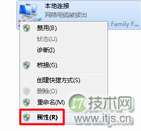 6、最后在不能正常上网的电脑上重新设置DNS:右击“本地连接”,选择“属性”项。