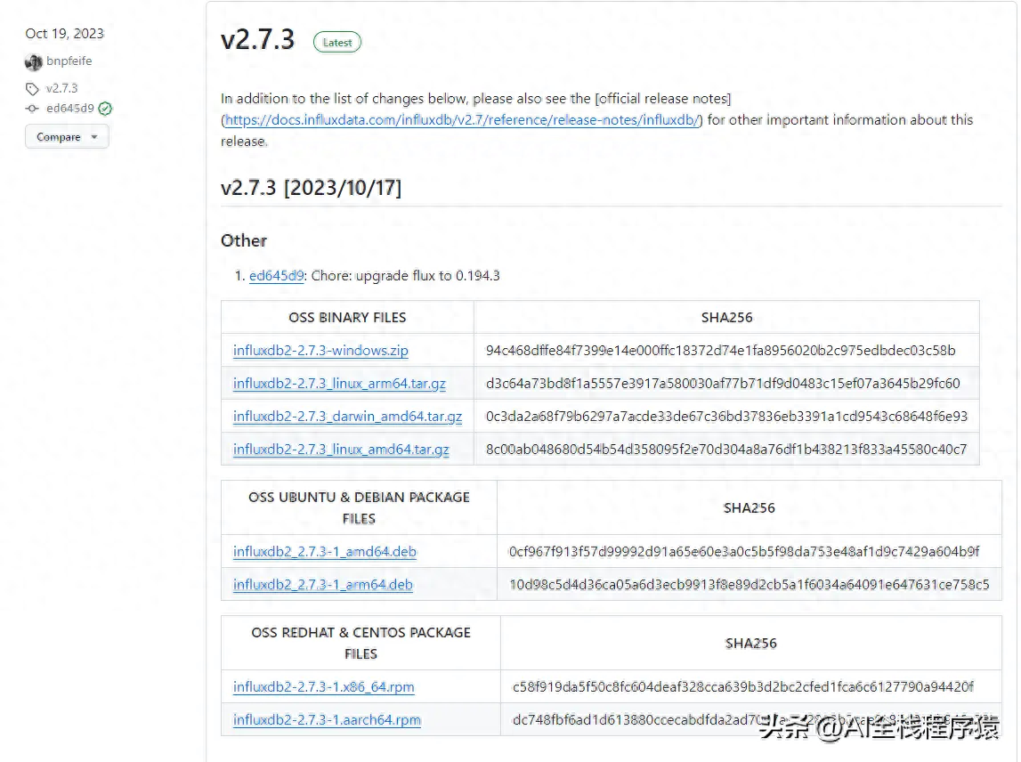 下载InfluxDB2安装包 https://github.com/influxdata/influxdb/releases ,这里选择rpm安装包 influxdb2-2.7.3-1.x86_64.rpm ,可以直接在服务器执行 :