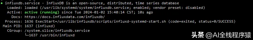 复制sudo systemctl start influxdb1.查看influxdb服务启动状态,结果显示Active: active (running)表示正在运行,服务启动成功。