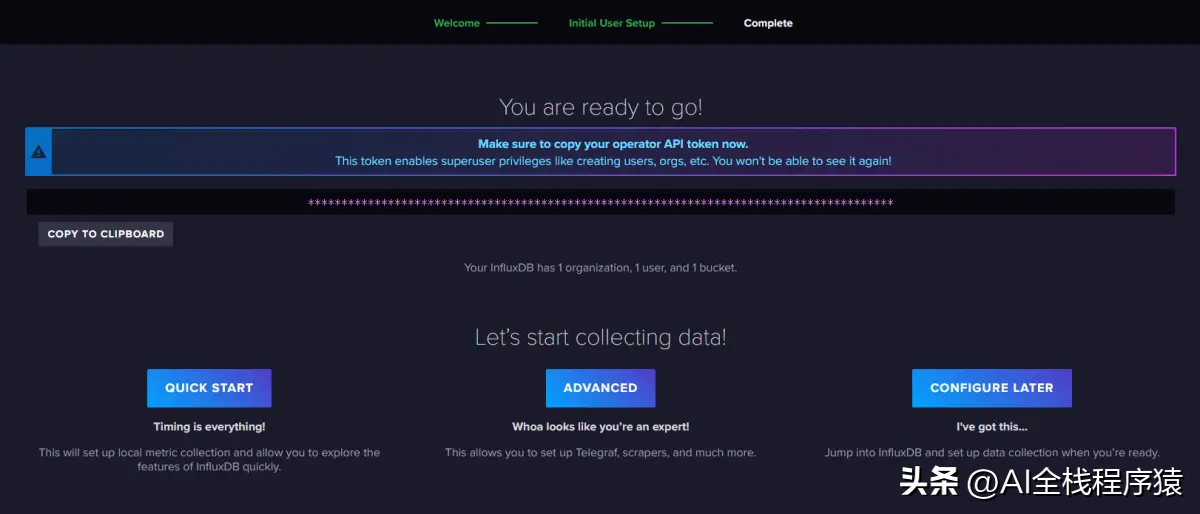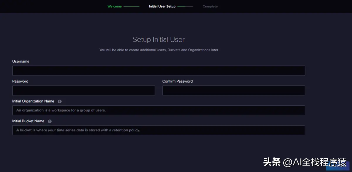 点击 GET STARTED按钮进入到用户配置界面,填写用户名/密码,Organization Name(工作区组织名称),填写Bucket Name,Bucket相当于Mysql数据库的库名。