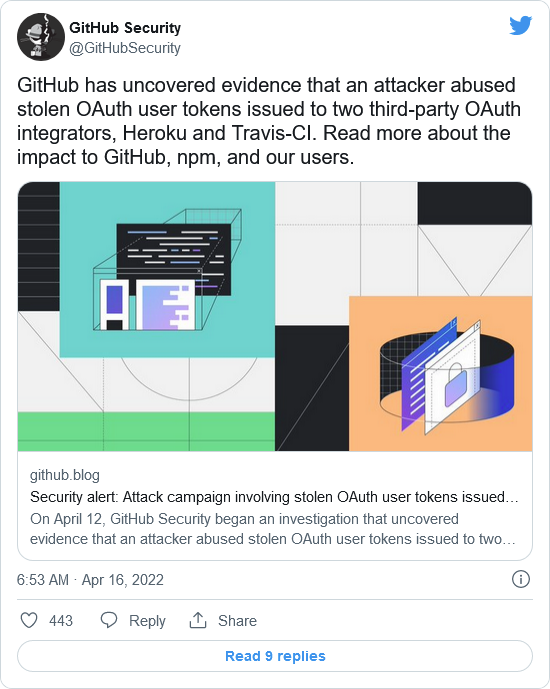 GitHub今天透露,透露一名攻击者正在使用偷来的攻击个组OAuth用户令牌(原本发放给Heroku和Travis-CI),从私人仓库下载数据。利织自2022年4月12日首次发现这一活动以来,用偷威胁者已经从几十个使用Heroku和Travis-CI维护的令牌OAuth应用程序(包括npm)的受害组织中访问并窃取数据。