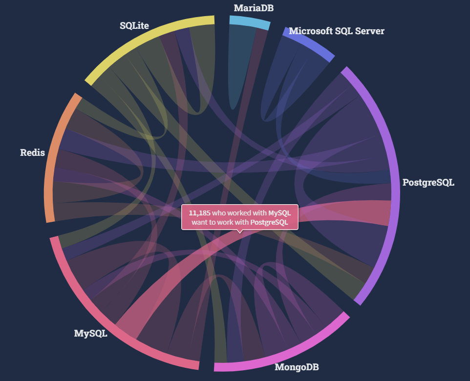 有 11185 名 MySQL 开发者想使用 PostgreSQL 工作,以及 9520 名 MySQL 开发者想使用 MongoDB 工作。