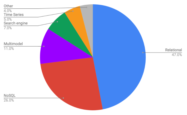其中,作为传统的SQL系统,关系数据库管理系统(RDBMS)仍占比最大,高达47%。而占比25%是NoSQL系统,涵盖了丰富的类型,包括:MongoDB之类的文档数据库、Redis之类的键值系统、ScyllaDB之类的宽列(wide column)数据库、以及Neo4j之类的图形数据库。而占比11%的“多模型”数据库包含了在同一系统中,同时支持SQL和NoSQL的混合体(如:Microsoft的Cosmos DB和ArangoDB),或支持多种NoSQL数据模型的数据库(如:DynamoDB,它将自己列为NoSQL键值系统和一个文件存储的集合)。