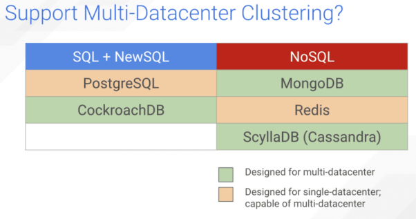 CockroachDB和ScyllaDB均有内置的拓扑感知特性。MongoDB从2015年后开始引入拓扑感知特性。Postgres和Redis最初被设计为单数据中心方案。虽然不是开箱即用的,但是您可以像添加多活功能那样,去手动添加拓扑感知服务。下面,我们根据上述各项分布式特点,对5种数据库进行属性上的总结和对比。