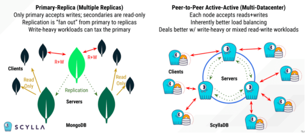 相反,ScyllaDB和Cassandra属于“无领导”的P2P多活(Active-Active)系统。由于客户端可以读取或写入任何同构的节点,因此避免了单点故障。也就是说,每个节点都可以更新集群中任何其他副本的数据。