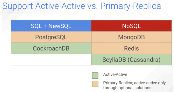 CockroachDB和ScyllaDB(以及Cassandra)是按照多活模式设计的。Postgres需要一些外部方法来实现多活,而并非内置。MongoDB并不支持多活。在Redis企业版中,我们可以使用无冲突的复制数据类型(conflict-free replicated data types,CRDT)来实现多活模式。注意,Postgres、MongoDB和Redis都默认会使用主副本的数据分布模式。