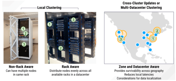 下面,让我们假设一个场景:如果您的所有节点都安装在同一个机架中,而整个机架出现了故障,那该怎么办呢?此时,我们需要用到同一数据中心内的机架拓扑感知,以确保将数据分布到该数据中心的多个机架中,从而最大限度地减少因电源或网络中断,而导致的整个机架与另一个机架失去连接。