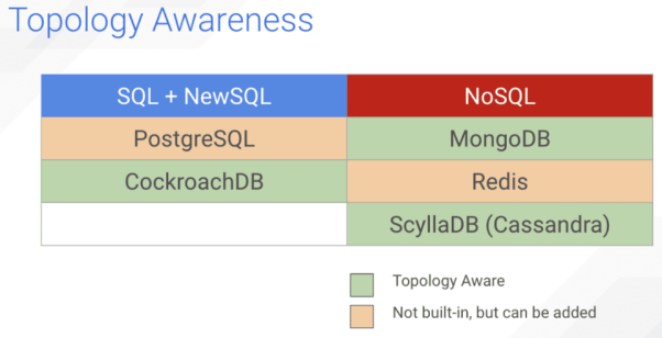 下面,我们来看看上述5种数据库在拓扑感知方面的表现: