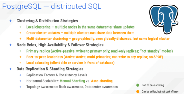 同时,Postgres依赖于主副本模型。集群中存在着主节点和副本节点的关系。您也可以额外地添加负载均衡器,或者多活附加组件。此外,Postgres虽然在自动化分片方面取得了一些进展,但是目前仍需要用户进行手动数据分片。