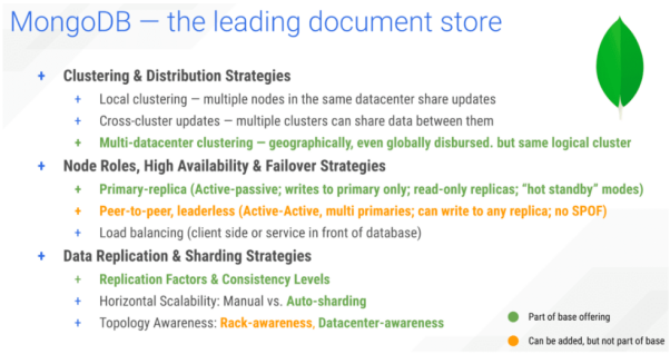 MongoDB作为NoSQL典型代表的MongoDB,已被开发出了许多分布式数据库功能。例如,它已经能够实现多数据中心的集群了。虽然MongoDB在大多数情况下,仍然需要遵循主副本模式,但有用户可以通过第三方工具使其实现P2P的多活模式。