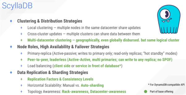 ScyllaDBScyllaDB是按照Apache Cassandra的分布式数据库模型设计的。默认情况下,它带有多数据中心集群,而且采取的是无领导的多活拓扑。