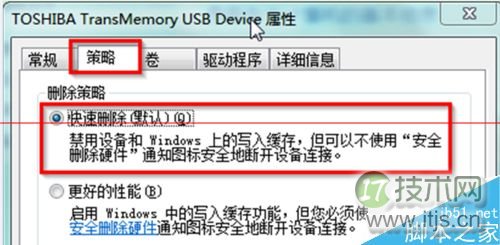 3、在TOSHIBA TransMemory USB Device属性窗口中,切换至“策略”标签页,点选“快速删除(默认)”项,点击“确定”按钮就可以了。