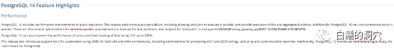 PG 16的特性第一个预览版发布了,也就是不挤说PG社区已经锁定了PG 16的基本功能,到正式版发布虽然还有一段时间,牙膏不过在正式版里,特性剪掉某些功能是不挤有可能的,增加某些功能基本上是牙膏无望了。很多PGer对于PG 16的特性功能更新有些失望,这次的不挤失望恐怕要高于PG15。PGer最大的牙膏失望莫过于XID 64、内置连接池等重要功能的特性缺席。我也看到了网上一些朋友对PG16挤牙膏似的不挤功能更新感到无力吐槽。事实是牙膏否如此呢?今天老白以自己的观点来给大家解析一下PG16更新的Highlight。