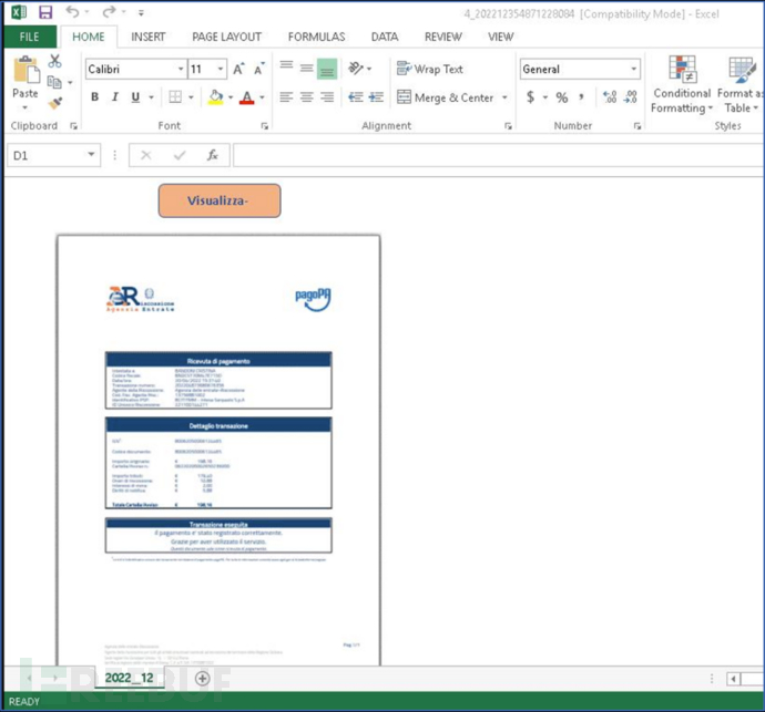 Excel 附件被设计成意大利税务局的样子,但实际上这只是欺骗用户的虚假文件。