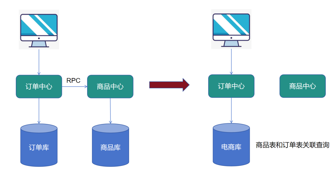 如果此时商品中心和订单中心所对应的数据表放在一个数据库中,可以预见的情况就是,研发人员会把订单表和商品表进行多表关联的方式来代替RPC调用+ 数据merge,因为这样做非常省事。