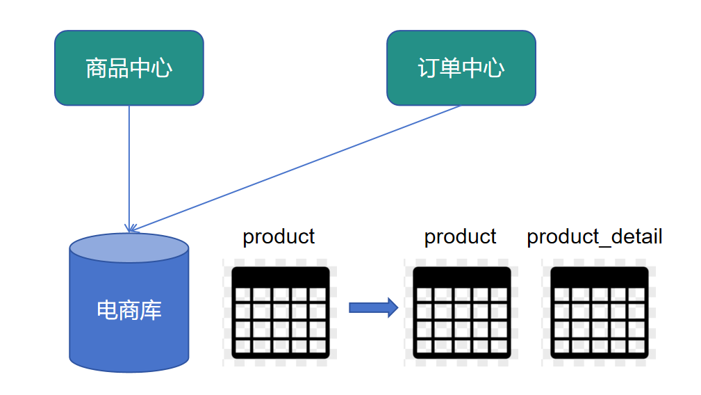 举个例子,如果我们把商品表进行垂直拆分,拆分成商品表 + 商品详情表,如果按照标准的独立数据库方式,只需要商品中心来进行对应的代码变更就可以了,这对依赖商品中心的其他服务来讲是透明的。