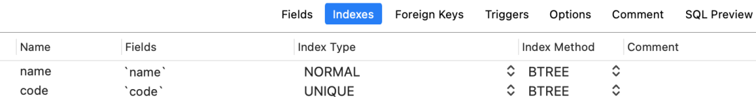 其中id是主键字段,code是唯一索引字段,name是普通索引字段,其他的都是普通字段。