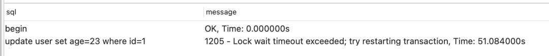 复制begin; update user set age=23 where id=1; commit;1.2.3.在执行事务2的sql语句的过程中,会一直等待事务1释放锁。