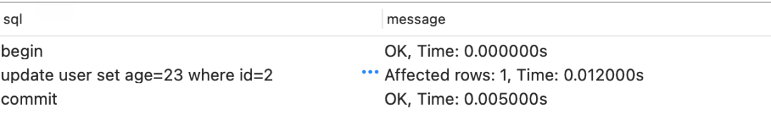 复制begin; update user set age=23 where id=2; commit;1.2.3.执行结果如下: