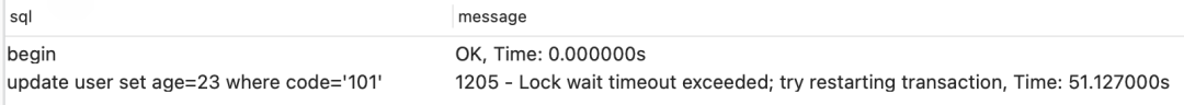 复制begin; select * from user where code=101 for update; update user set age=22 where code=101;1.2.3.where条件中的code是数据库的唯一索引,并且使用for update关键字,加了一个行锁,这个事务没有commit。