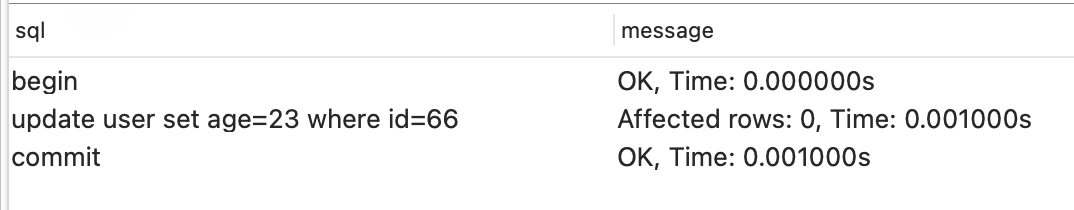 复制begin; update user set age=23 where id=66 ; commit;1.2.3.执行结果: