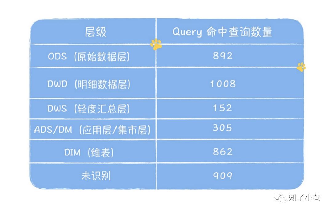 在已识别的分层的查询中,ODS:DWD:DWS:ADS的命中的查询分别是892:1008:152:305,有37.8%的查询直接命中ODS层原始数据,说明DWD、DWS、ADS层数据建设缺失严重。尤其是ADS和DWS,查询越底层的表,就会导致查询扫描的数据量会越⼤,查询时间会越⻓,查询的资源消耗也越⼤,使⽤数据的高防服务器⼈满意度会低。