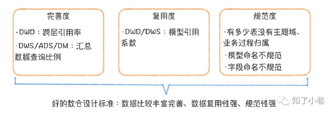 DWS/ADS/DM层完善度:考核汇总数据的完善度,主要看汇总数据能直接满⾜多少查询需求(也就是⽤汇总层数据的查询⽐例衡量)。如果汇总数据⽆法满⾜需求,使⽤数据的⼈就必须使⽤明细数据,甚⾄是原始数据。