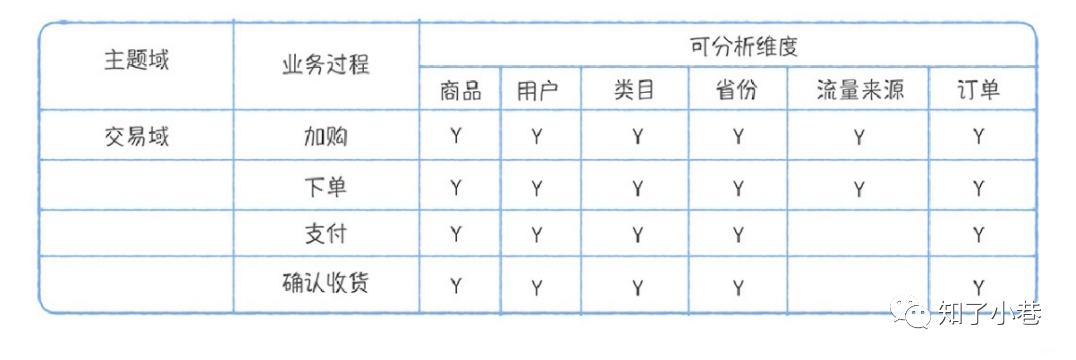 主题域划分好以后,就要开始构建总线矩阵,明确每个主题域下的业务过程有哪些分析维度,举个例⼦: