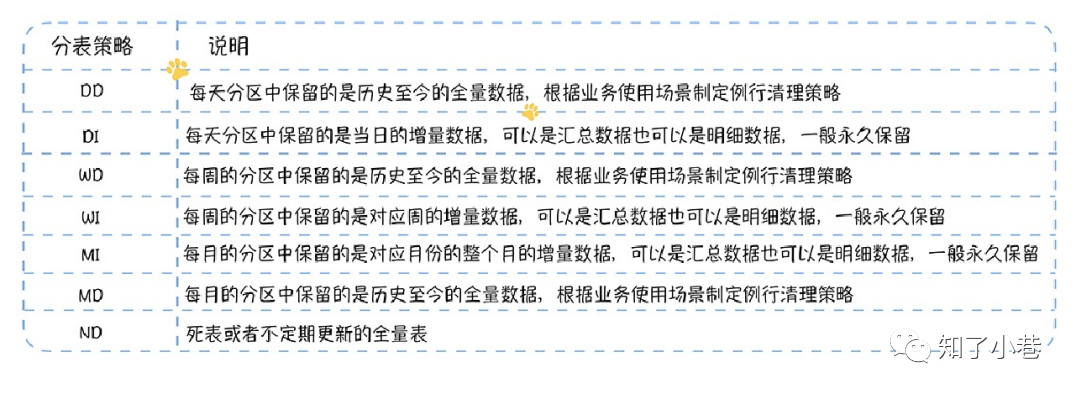 对于维表的规范化命名,建议⽤“dim_主题域_描述_分表规则”⽅式。分表可以这样理解:⼀个表存 储⼏千亿⾏记录实在是太⼤了,所以需要把⼀个表切割成很多⼩的分区,每天或者每周,随着任务被调度,会⽣成⼀个分区。常⻅的分区规则(用时查询)。