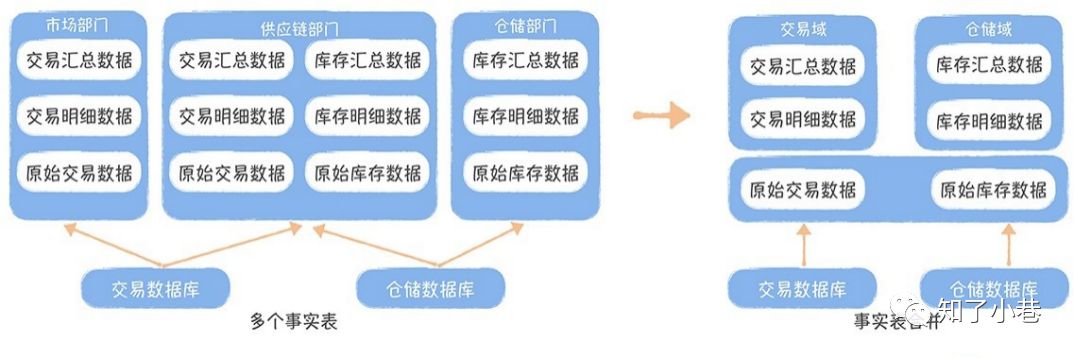 在数据中台构建前,供应链部⻔、仓储部⻔和市场部⻔都有⼀些重复的事实表,我们需要将这些重复的内容进⾏去除,按照交易域和仓储域,主题域的⽅式进⾏整合。