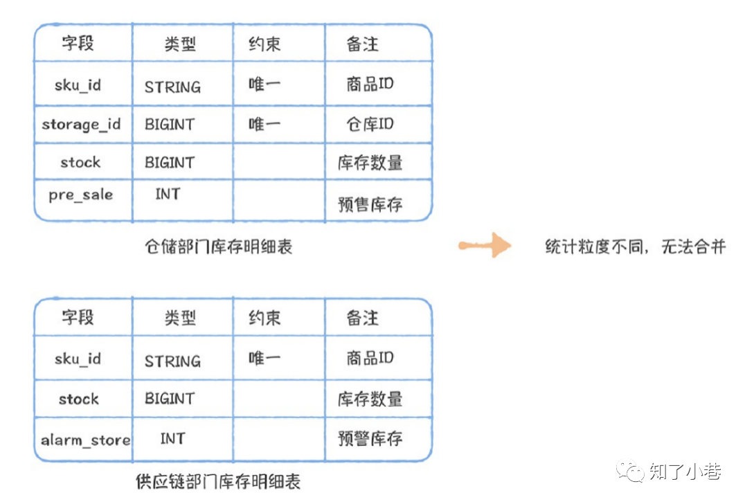 对于仓储部⻔和供应链部⻔都有的库存明细表,因为仓储部⻔的统计粒度是商品加仓库,⽽供应链部⻔的只有商品,所以原则上两个表是不能合并,⽽是应该独⽴存在。