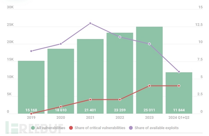 【2019-2024年漏洞数量、关键漏洞和存在漏洞利用的漏洞比例】