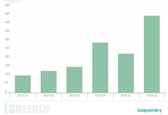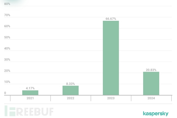 正如我们所看到的,2023年是BYOVD攻击工具最丰富的一年。2024年上半年发布的工具数量比2021年和2022年的总和还要多。卡巴斯基进一步评估了在实际攻击中使用此类软件的趋势,具体所下所示: