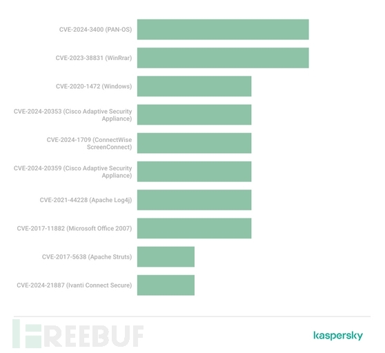 尽管APT攻击中常见的漏洞列表与第一季度相比截然不同,但攻击者最常利用相同类型的软件/硬件解决方案的漏洞来访问组织的内部网络:远程访问服务、访问控制机制和办公应用程序。请注意,该排名中2024年的漏洞在发现时就已经被利用,也就是说,它们是零日漏洞。